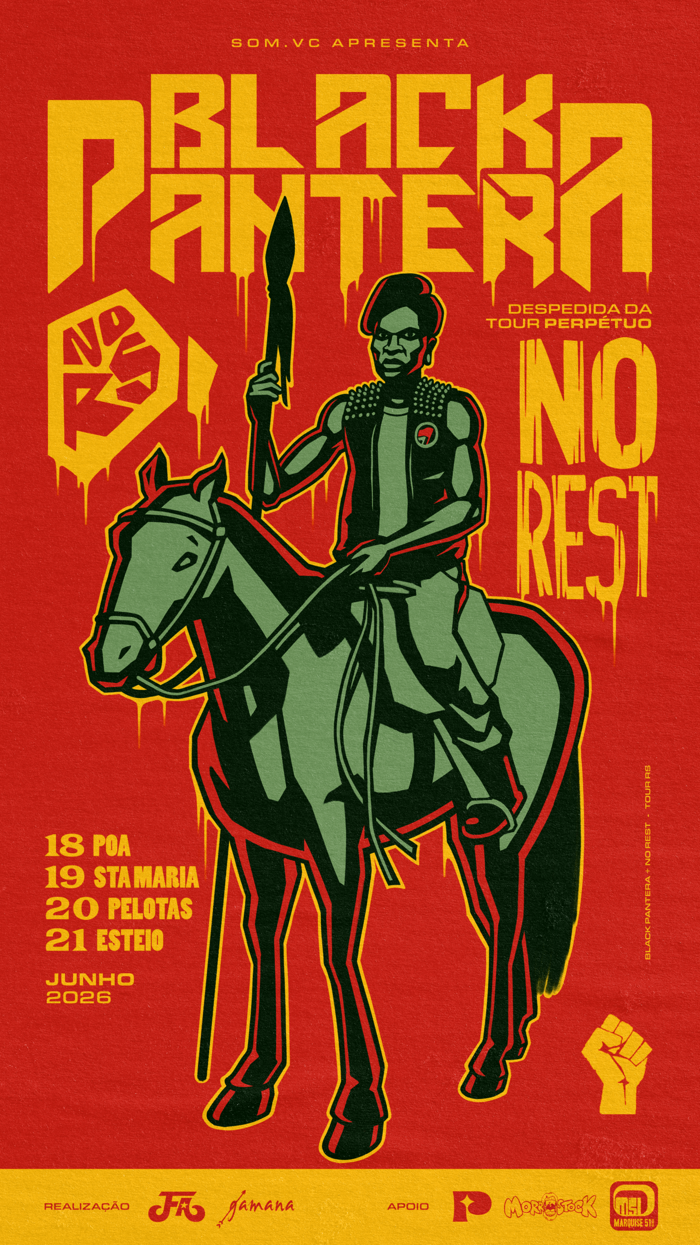 É pelo 2° ano consecutivo que No Rest e Black Pantera se unem para apresentar ao público do estado o engajamento e a força de suas músicas. Espere por shows enérgicos que instigam questões fundamentais de nosso tempo, a luta antirracista, feminista e antifascista, de forma que as duas bandas têm sua impulsão singular e marcante.